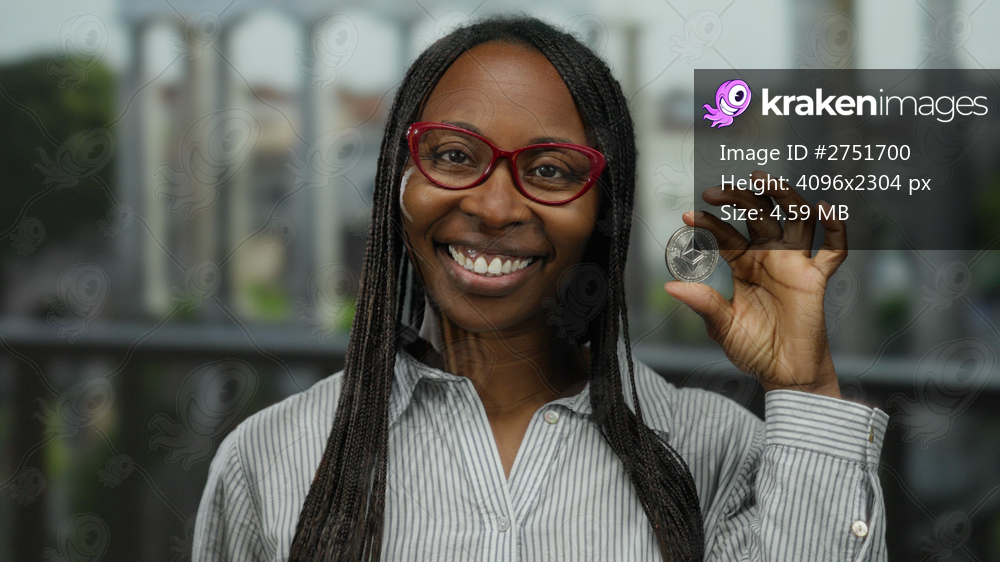 Woman smiling while holding ethereum coin in an outdoor urban setting showcasing cryptocurrency interest and modern financial trends.