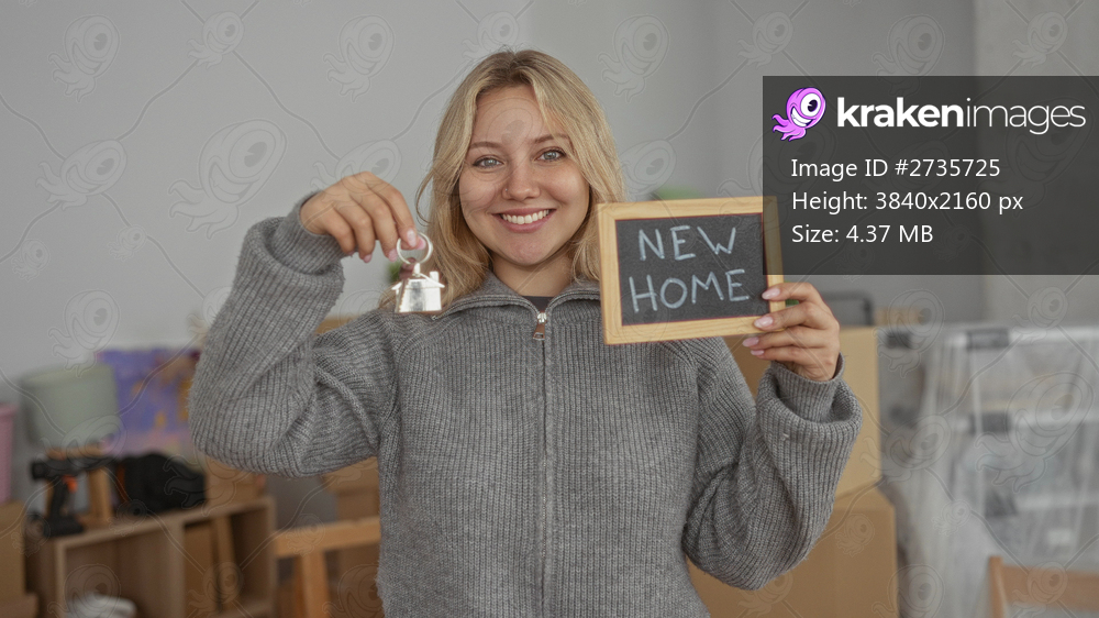 Woman smiling while holding keys and a new home sign in an apartment with boxes around, symbolizing moving and new beginnings in a cozy interior setting. - Kraken Images