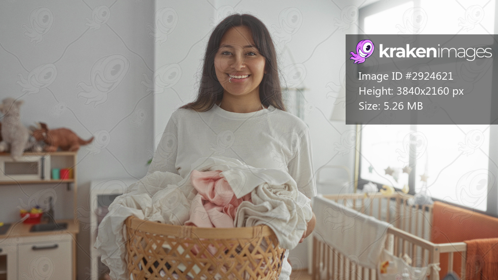 Woman smiling while holding laundry basket in baby room with crib and cradle visible; home nurturing serenity.