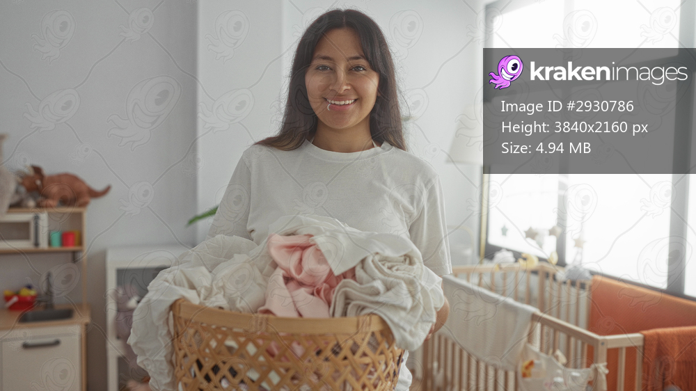 Woman smiling while holding laundry basket in baby room with crib and cradle visible; home nurturing serenity.