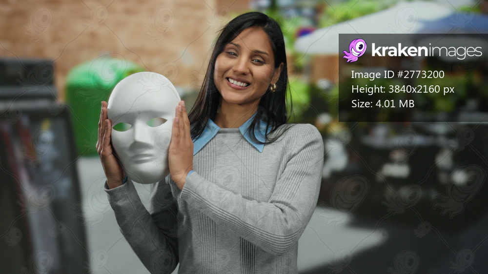 Woman smiling while holding mask on terrace at outdoor restaurant showing happiness and anonymity in urban setting during daytime for stock imagery.