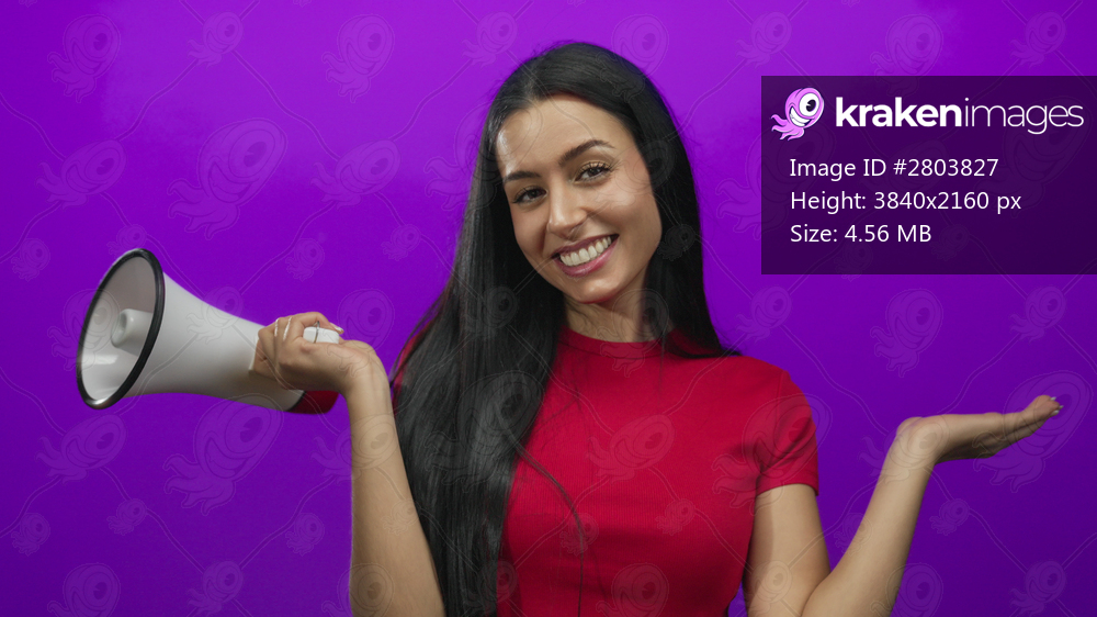 Woman smiling while holding megaphone against vibrant purple background signifying communication and enthusiasm