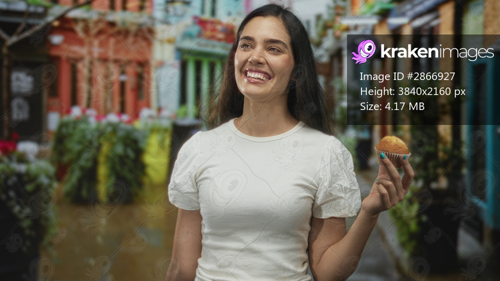 Woman smiling while holding muffin and looking upward wearing white shirt under bright sunlight on busy street; joy.