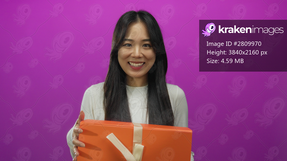 Woman smiling while holding orange gift against isolated pink background in celebration concept setting