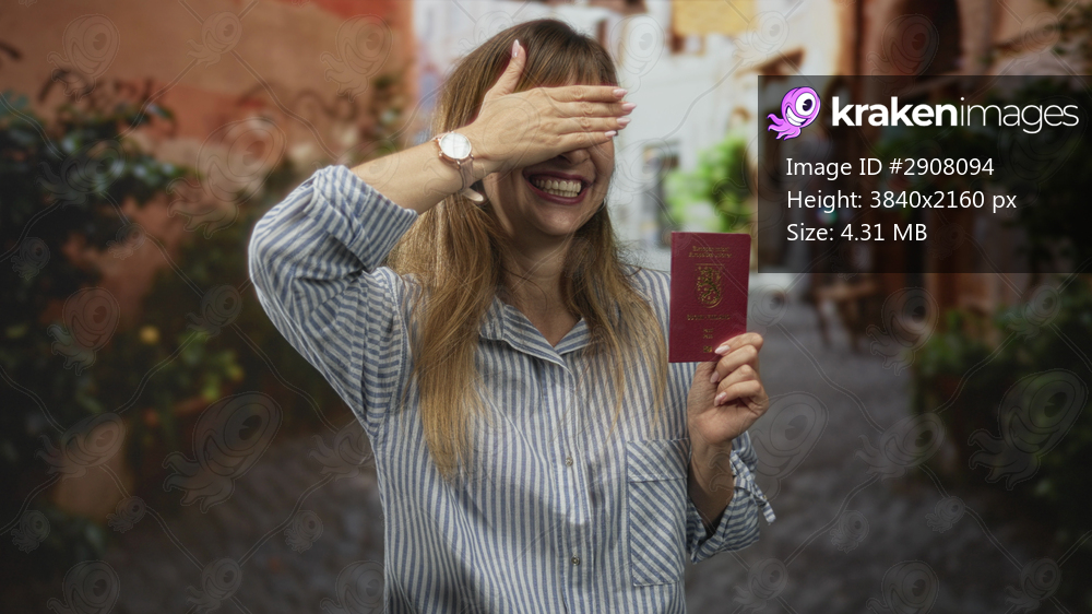 Woman smiling while holding passport and covering eyes with hand in narrow cobbled street; travel joy celebration.