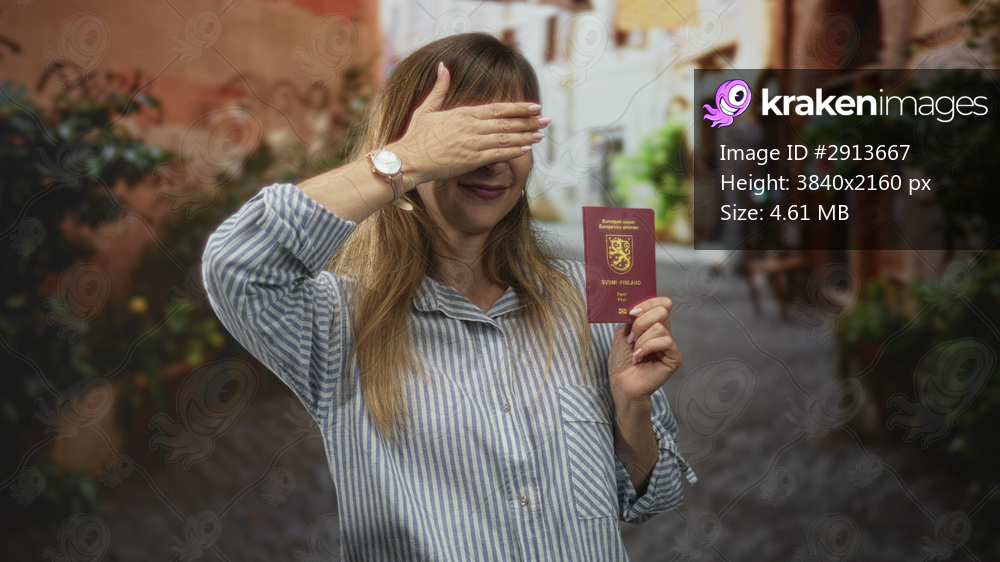 Woman smiling while holding passport and covering eyes with hand in narrow cobbled street; travel joy celebration.