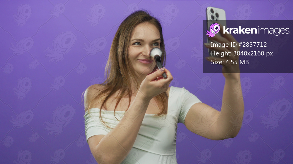Woman smiling while holding smartphone and applying makeup brush to cheek and taking selfie in purple studio; confidence.