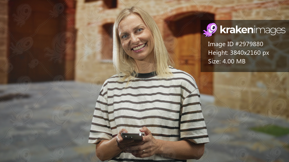 Woman smiling while holding smartphone with hands, standing by stone doorway of a building; happiness connection.