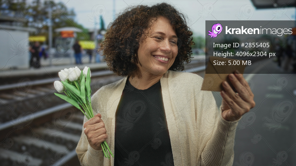 Woman smiling while holding tulips and letter envelope at train station platform; joy anticipation hope.