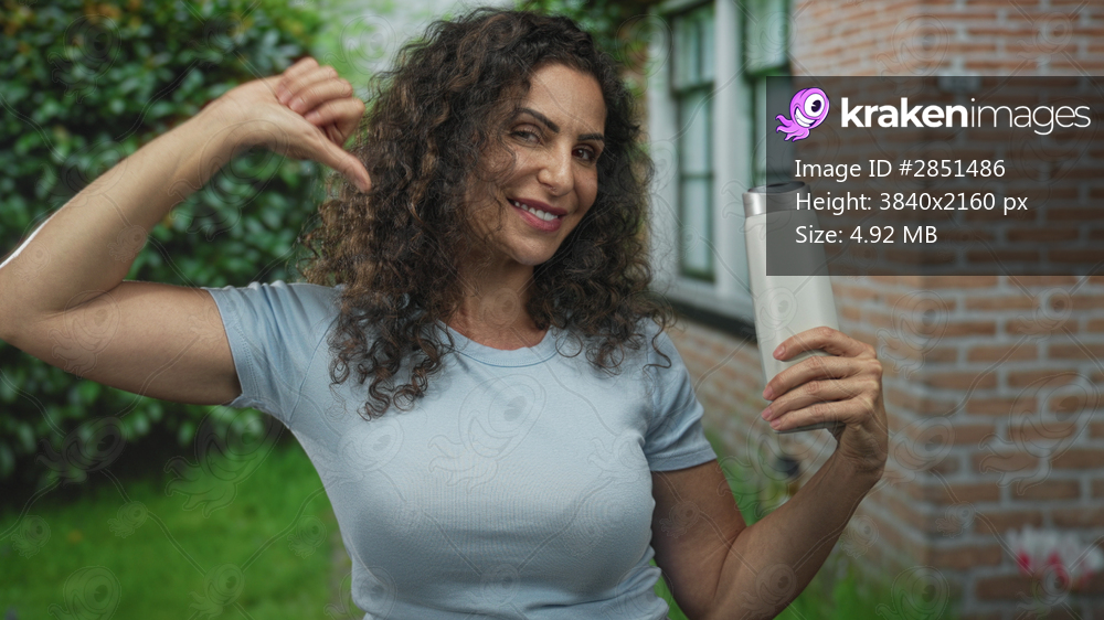 Woman smiling while holding white water bottle and pointing thumb to chest at home entrance; confidence.