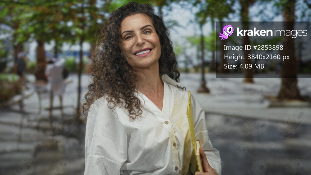 Woman smiling while holding yellow folder and notebook on bustling urban street sidewalk; confidence determination success.