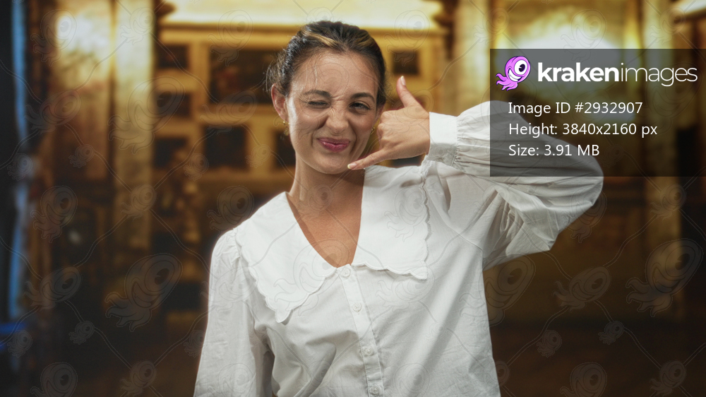 Woman smiling while making a call gesture with hand to ear inside ornate church building with chandeliers and paintings; playful invitation.