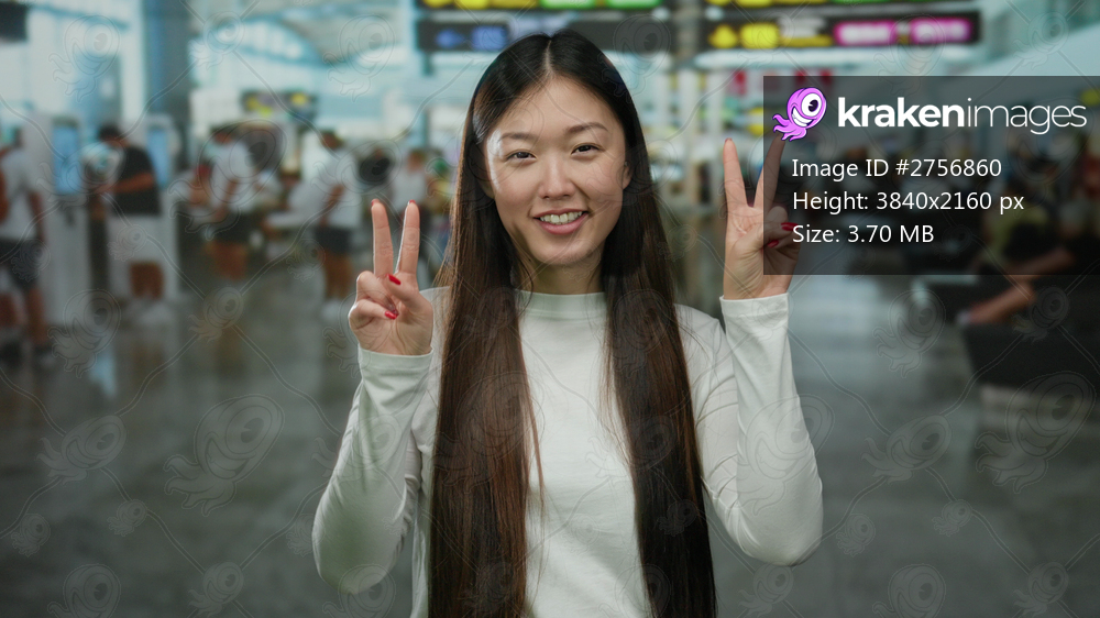 Woman smiling while making peace signs in a bustling airport terminal, suggesting a joyful travel experience in a dynamic indoor setting.