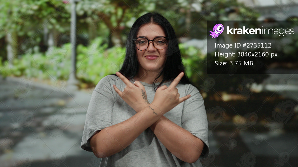 Woman smiling while making rock gesture with hands in outdoor park setting showcasing confidence and positivity with trees in background.