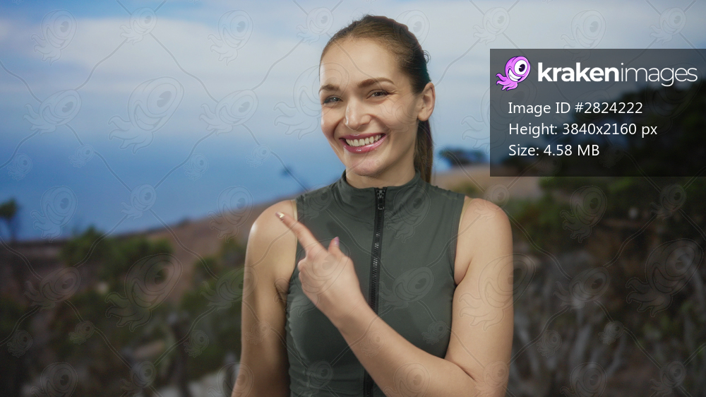 Woman smiling while pointing finger to distant forest landscape with rolling hills under clear blue sky; joy.