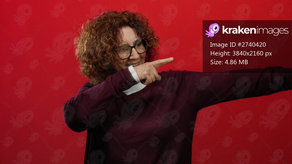 Woman smiling while pointing on a vibrant red background, showcasing confident expressive gesture with curly hair and glasses.