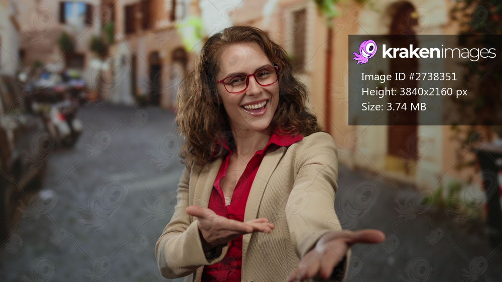 Woman smiling while reaching out her hand on a charming city street, exuding happiness and confidence with vibrant attire and urban backdrop.