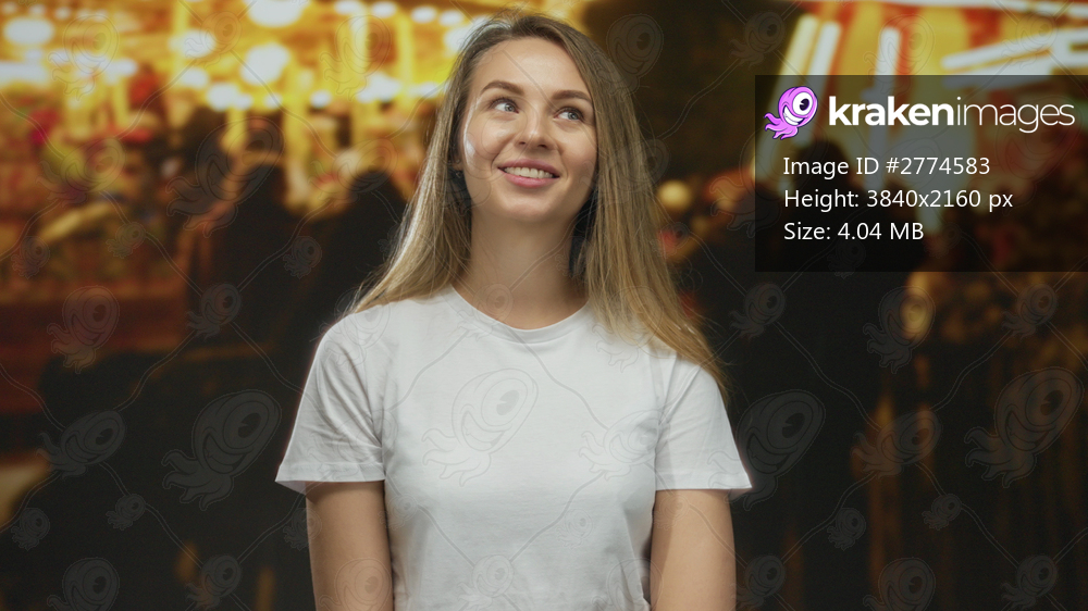Woman smiling while standing at a vibrant night fair with lights in the background suggesting a cheerful atmosphere.