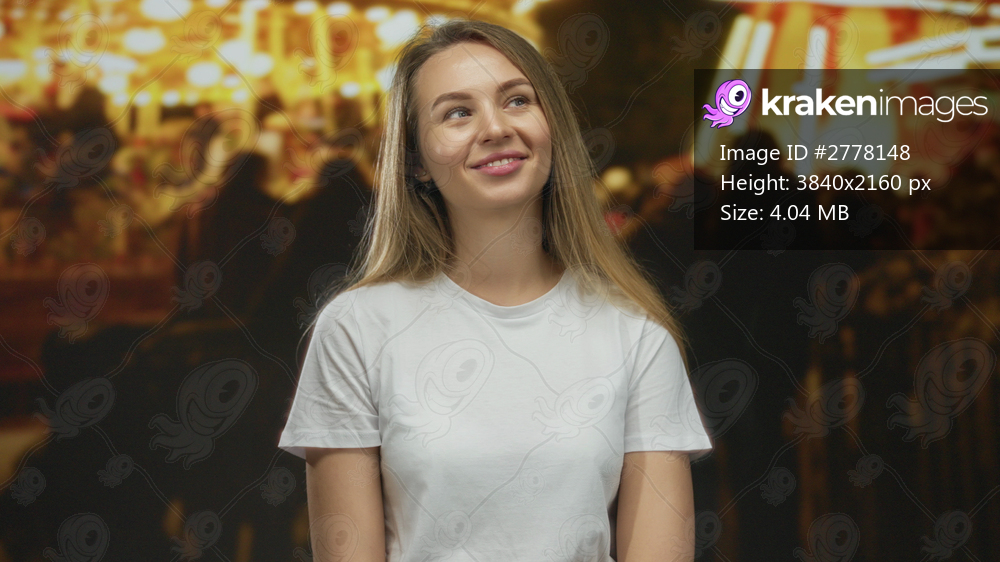 Woman smiling while standing at a vibrant night fair with lights in the background suggesting a cheerful atmosphere.
