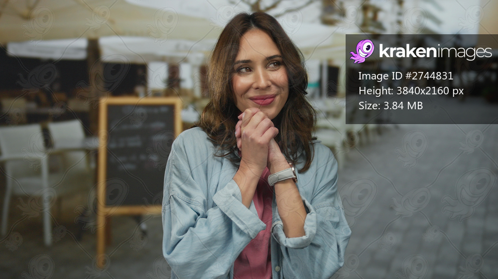 Woman smiling while standing on a vibrant city terrace with coffee shops and restaurants nearby, exuding a cheerful atmosphere.