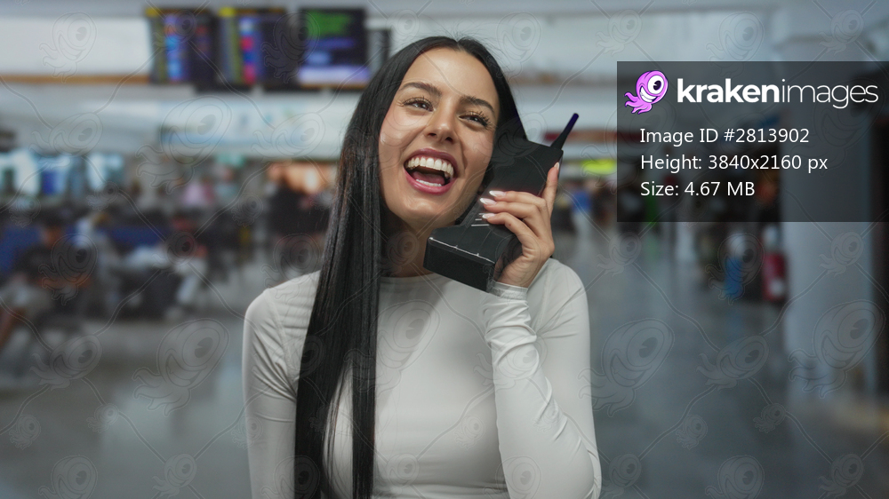 Woman smiling while talking on a vintage phone at a busy airport terminal reflecting a lively travel atmosphere.