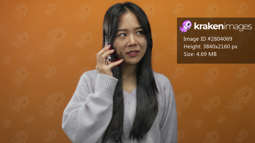 Woman smiling while talking on mobile against vibrant orange background, highlighting youthful asian features and casual attire in an isolated setting. - Kraken Images