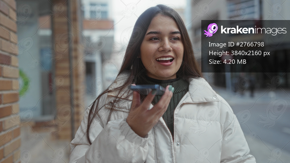 Woman smiling while talking to the phone on a city street, wearing a white jacket, embodies urban lifestyle and communication in an outdoor setting.