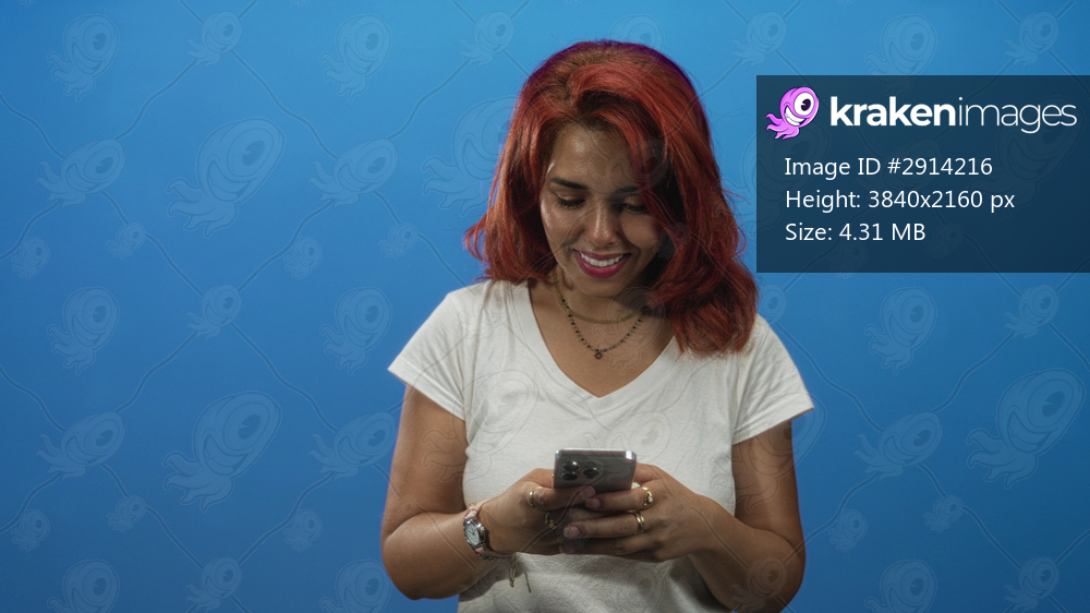 Woman smiling while typing on smartphone, hands and fingers visible, wearing white tee and necklaces in blue studio; happiness connection.