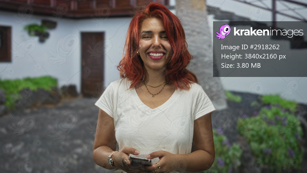 Woman smiling while typing on smartphone near stone staircase at white building entrance; digital joy connection.