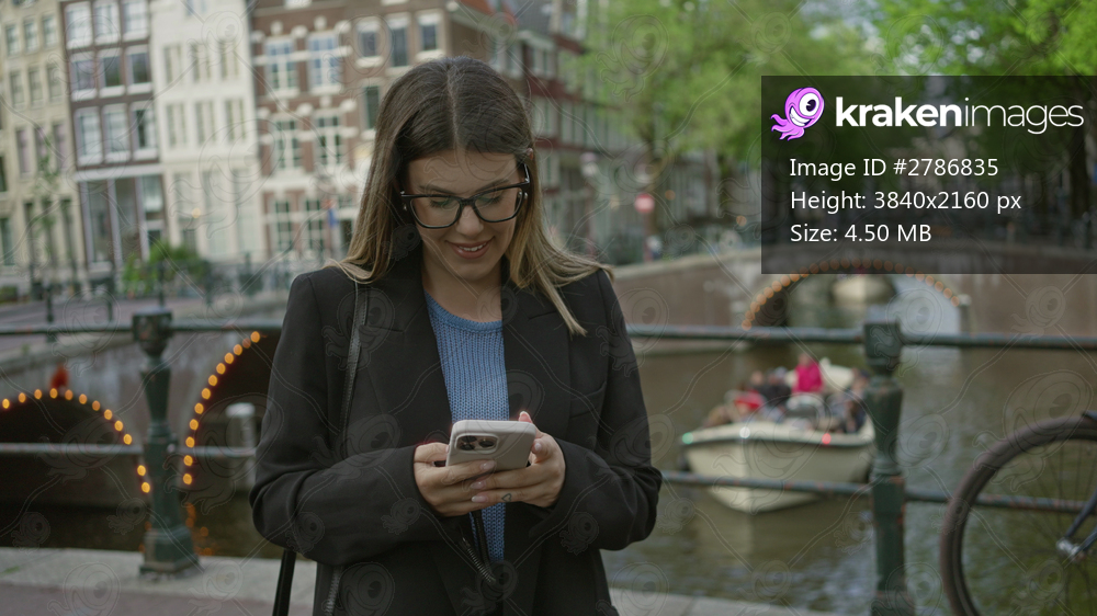 Woman smiling while using smartphone by amsterdam canals with lush trees and historic buildings in the background.