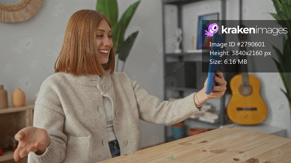 Woman smiling while video chatting with tablet in cozy living room, featuring a guitar and decorative plants, capturing modern home lifestyle and technology use. - Kraken Images
