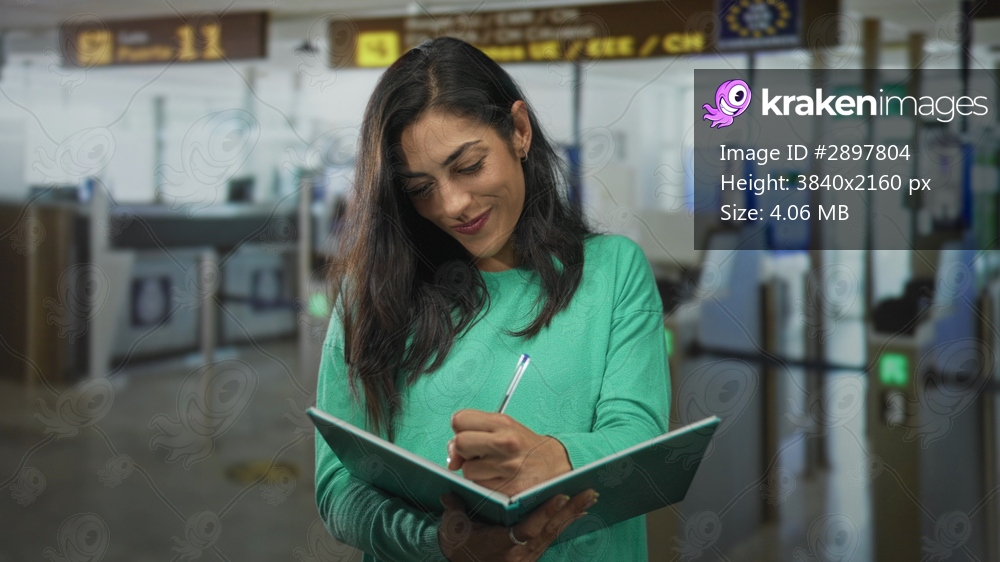 Woman smiling while writing in a notebook with a pen at an airport terminal check in area; trip planning calm.