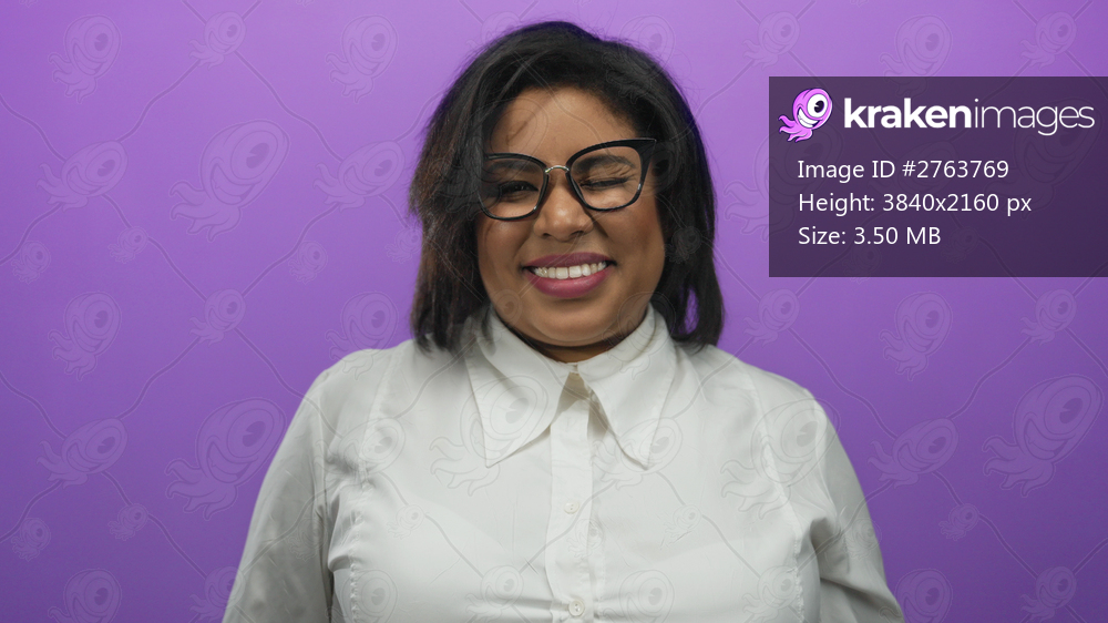 Woman smiling and winking against a vibrant purple background wearing glasses and a white shirt.