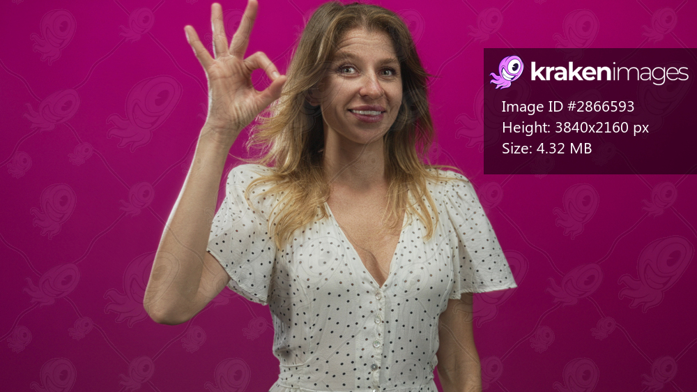 Woman smiling and winking while making ok hand gesture in magenta studio, wearing white polka dot dress, playful pose and friendly grin; joy approval.