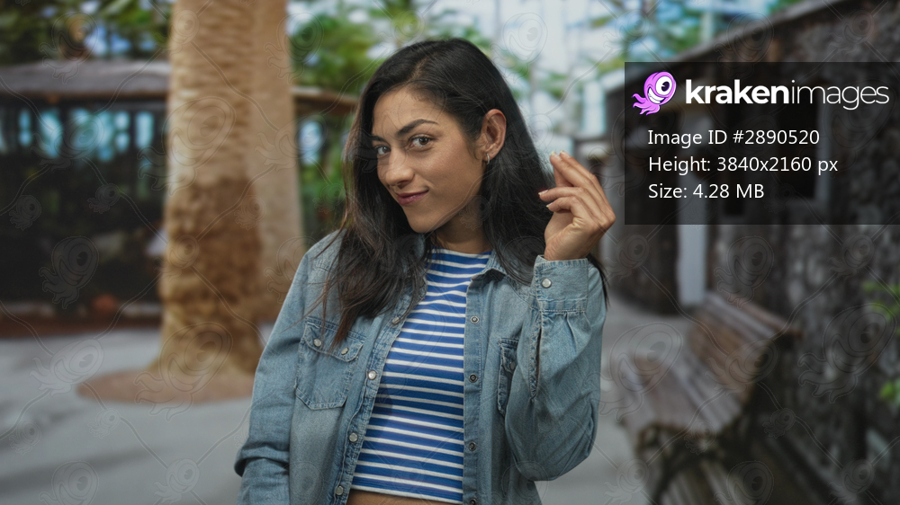 Woman snapping fingers with hand near face on a street courtyard by a bench and tree; confidence playfulness charm.
