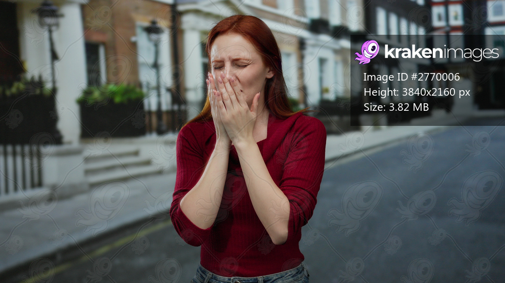 Woman sneezing on city street with red hair and red shirt, showing discomfort during outdoor allergy season.