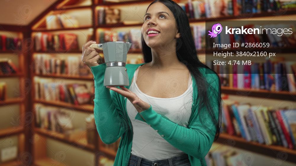 Woman sniffing coffee maker with nose in library full of colorful books on wooden shelves and bright lights; serenity.