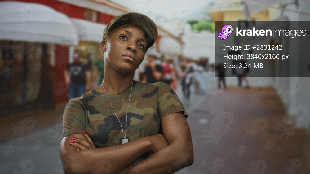 Woman soldier confidently crosses arms on busy city street wearing camouflage uniform and dogtags; pride duty.