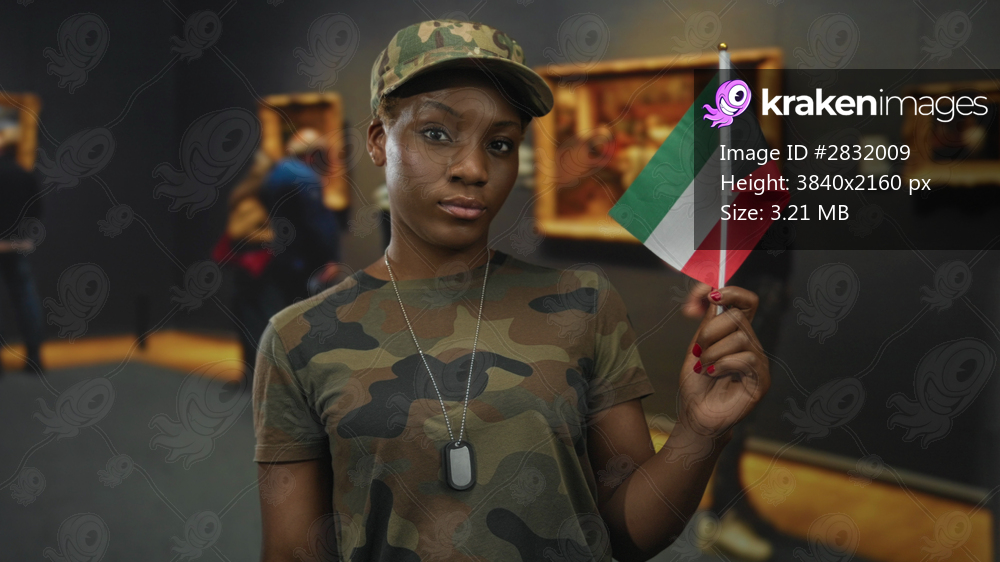 Woman soldier holding kuwait flag while wearing camouflage uniform and dogtag in gallery building; pride solidarity.