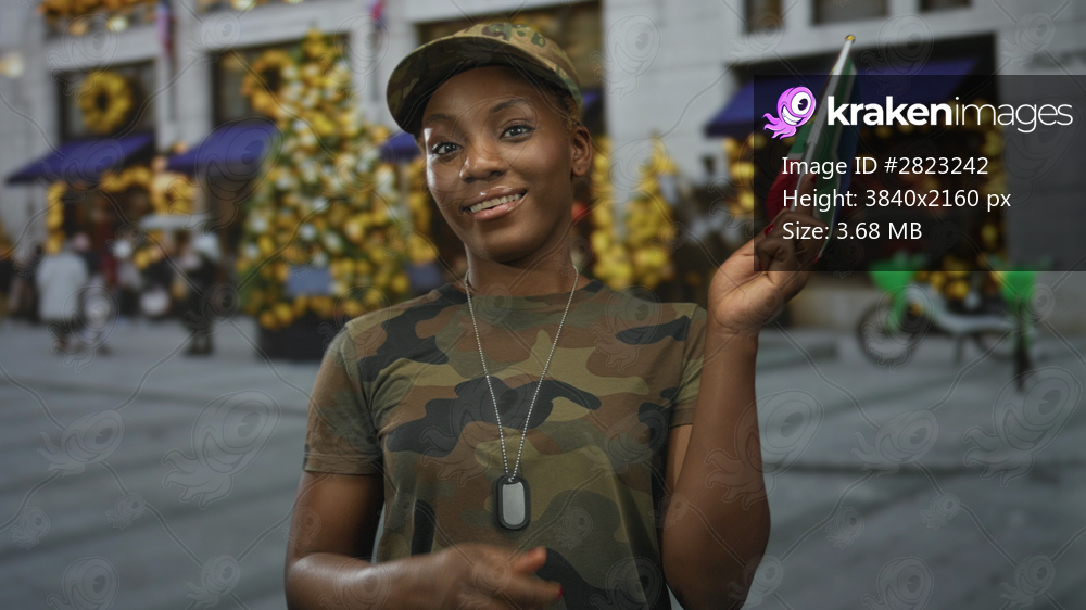 Woman soldier holding south african flag on street wearing camouflage cap and dogtag smiling under building lights; pride duty.