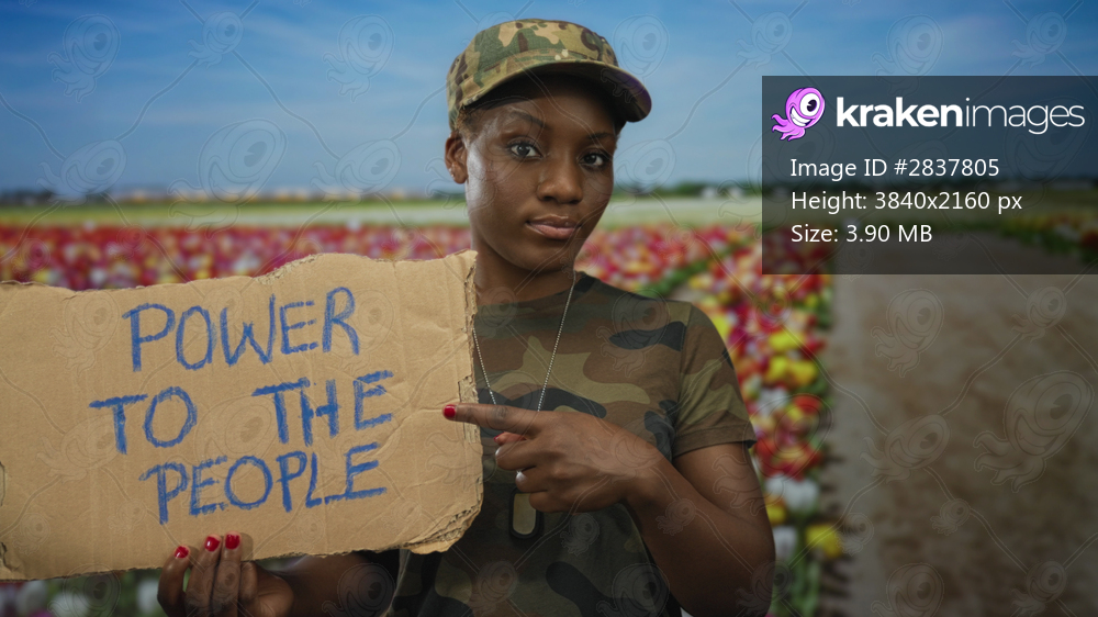 Woman soldier holds cardboard sign reading power to the people under blue sky in forest; protest empowerment.