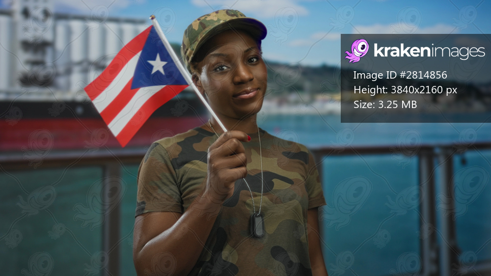 Woman soldier holds puerto rico flag on boat deck wearing camouflage uniform with dog tag; heritage loyalty pride.