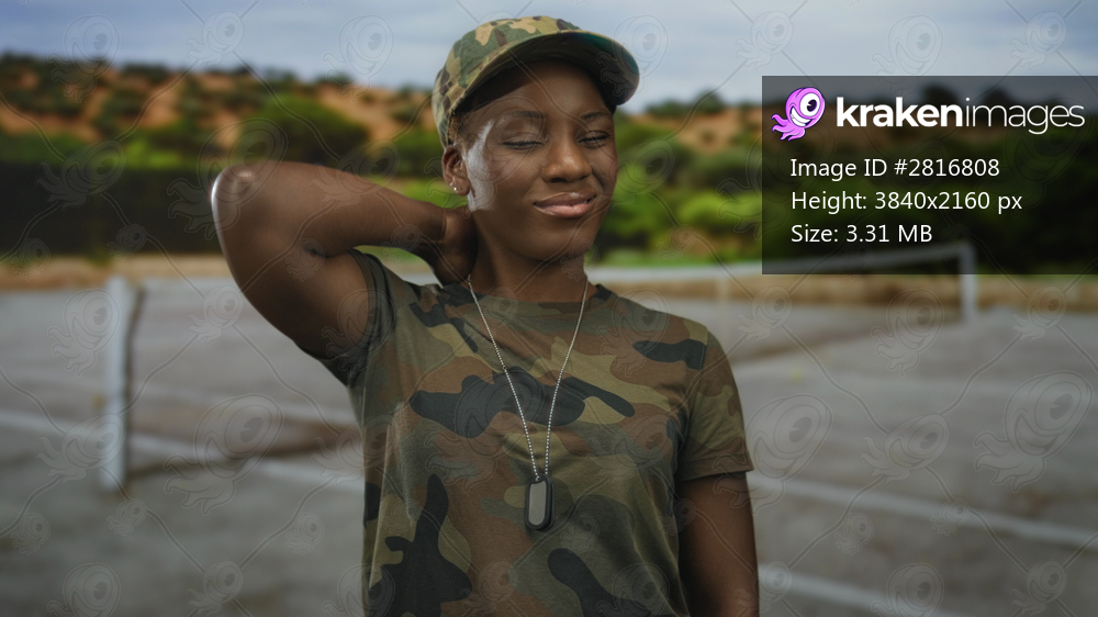 Woman soldier in camouflage uniform holds dog tags and rests hand on neck on sunlit street; calm resilience.