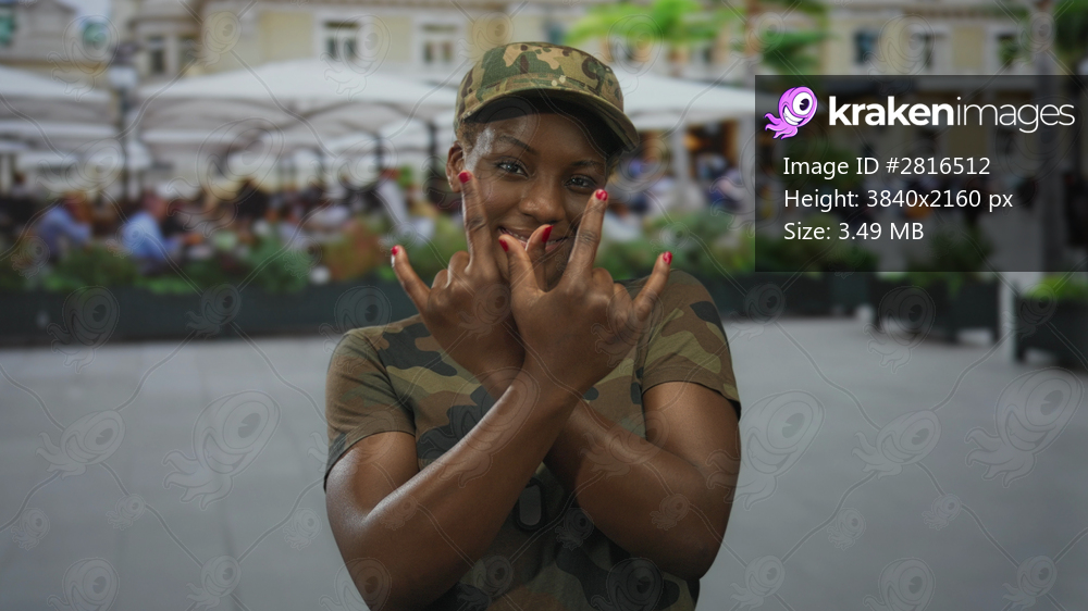 Woman soldier in camouflage uniform shows dogtag and makes rock horns gesture on street outside a building; fun.