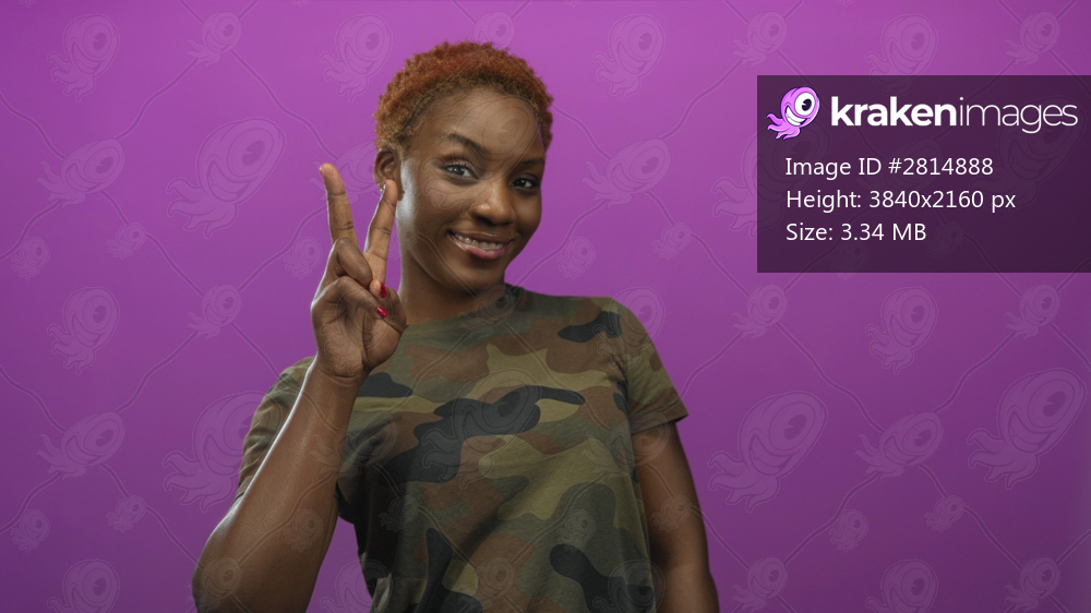 Woman soldier in camouflage uniform smiles holding fingers in money gesture in purple studio; wealth aspiration.