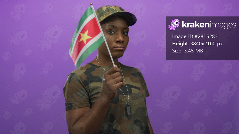 Woman soldier wearing camouflage cap and dogtags holds suriname flag in studio with purple background; pride duty.