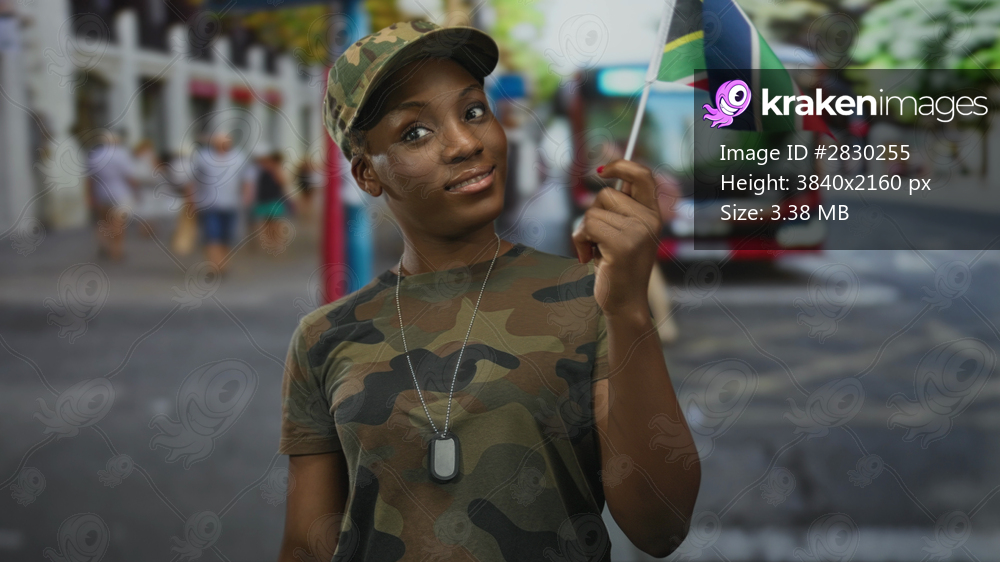 Woman soldier wearing camouflage uniform and dog tag necklace waves south african flag on street; pride duty.