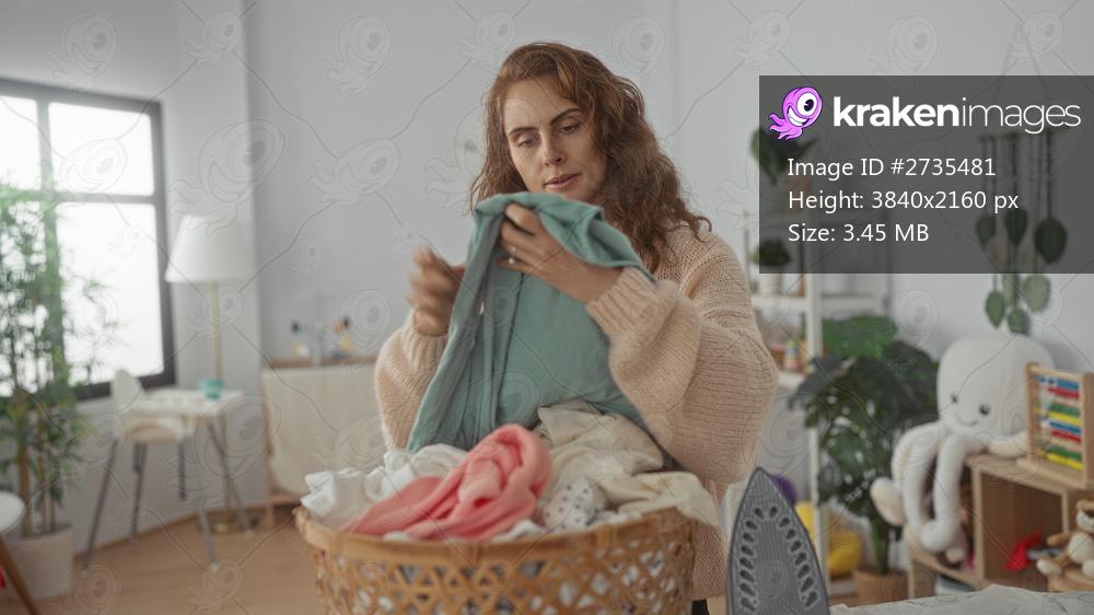 Woman sorting laundry in a cozy room, focusing on cleanliness and home duties with an organized and domestic atmosphere, captured in a beautifully lit laundry setting. - Kraken Images