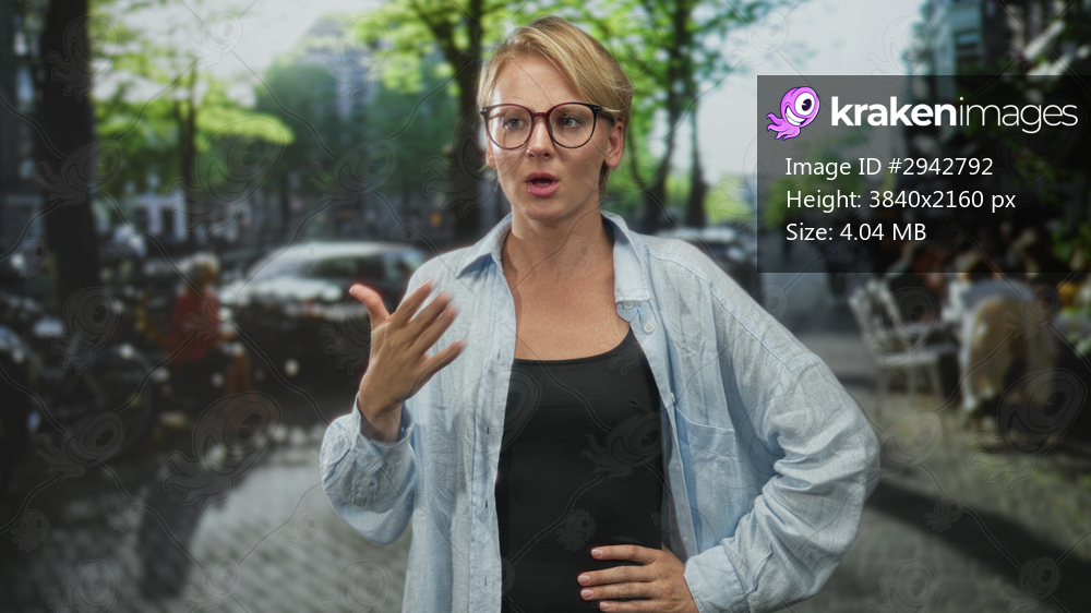 Woman speaking and gesturing hand to chest then covering mouth on a cobblestone street by an outdoor cafe; breathless concern.