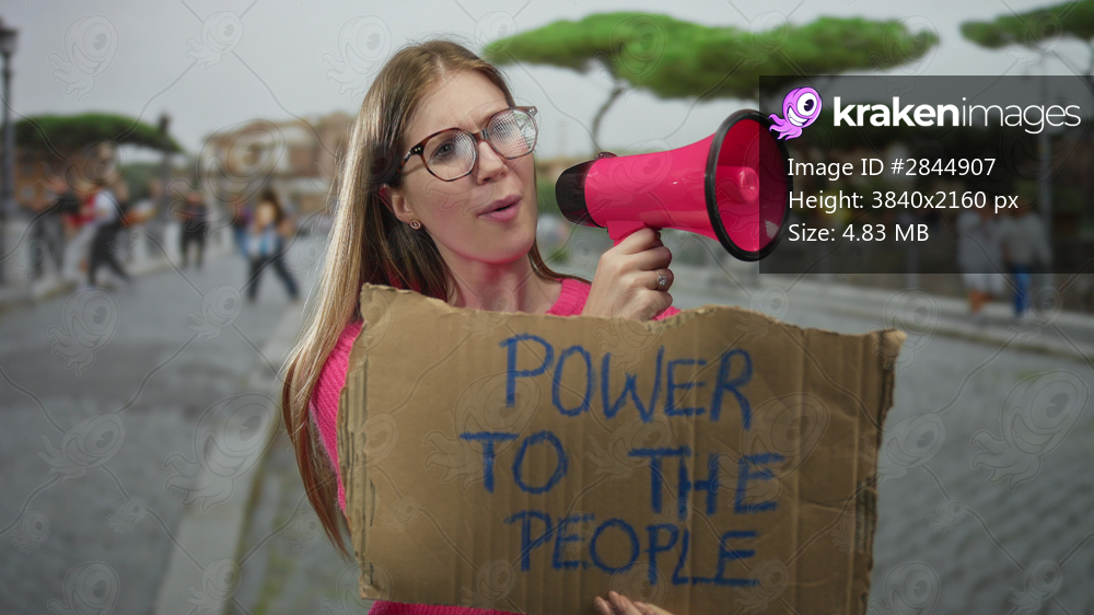 Woman speaking into megaphone while holding protest sign on city street; social justice empowerment determination.
